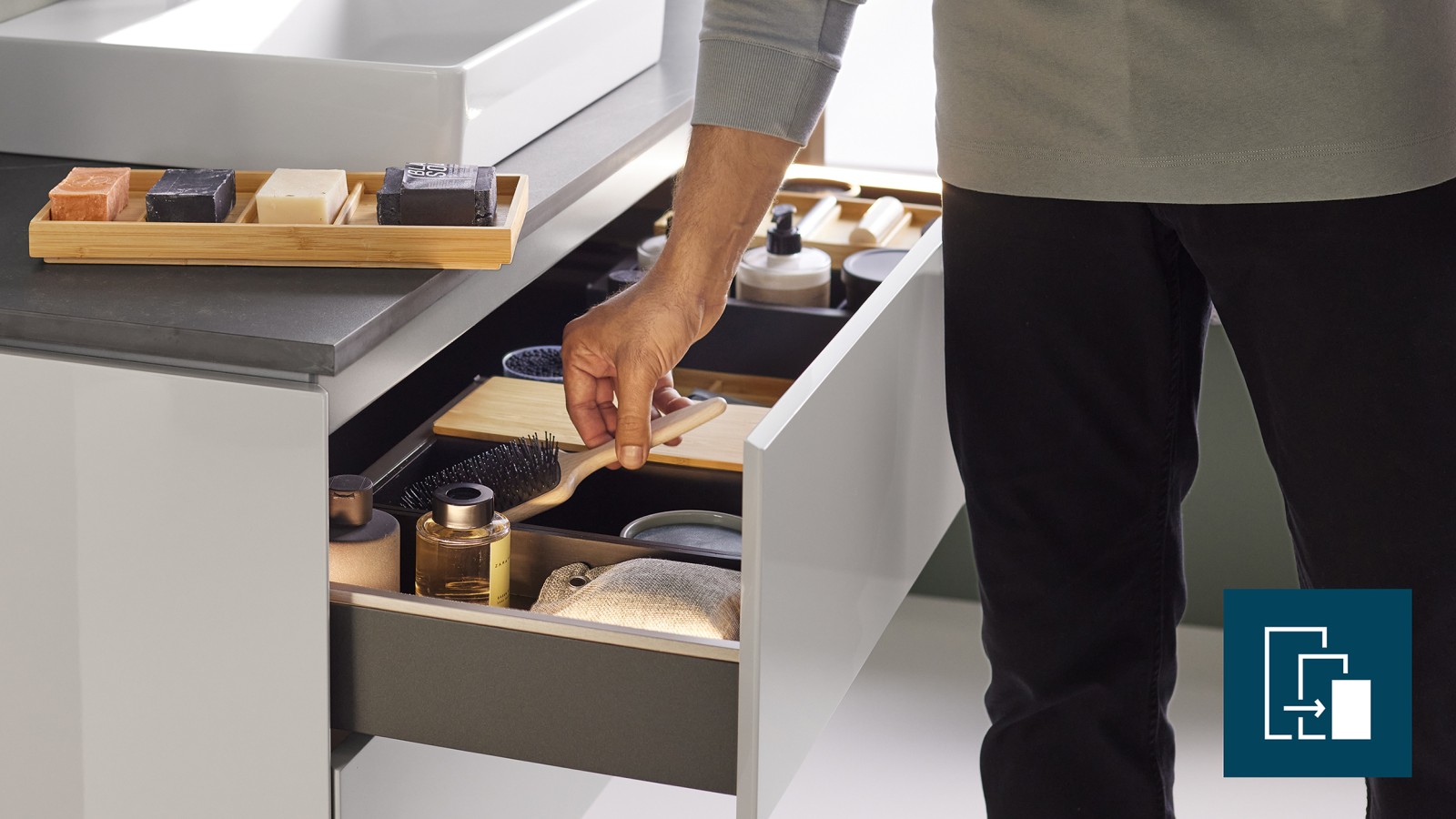 Det som er på innsiden teller også! Toalettartikler kan oppbevares ryddig i oppbevaringsbokser og organiserelementer i skuffen. Til baderomsseriene Geberit ONE, Geberit Acanto og Geberit iCon finnes det et modulært organiseringssystem med innsatser i bambus- og lavastein-farger. De modulære settene er tilpasset ulike skuffebredder og kan velges som tillegg.